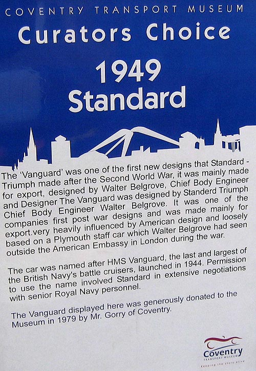 Jan Further to your post 10 months and three weeks ago, here is the Standard Vanguard on display at the Coventry Transport Museum which I visited in May 2011, leaving my wife and sister-in-law in the local Primark Store. I had a far more interesting time than looking around for clothes! I could not tell if the Vanguard was the first version with the rear axle clip or not!! :laugh: