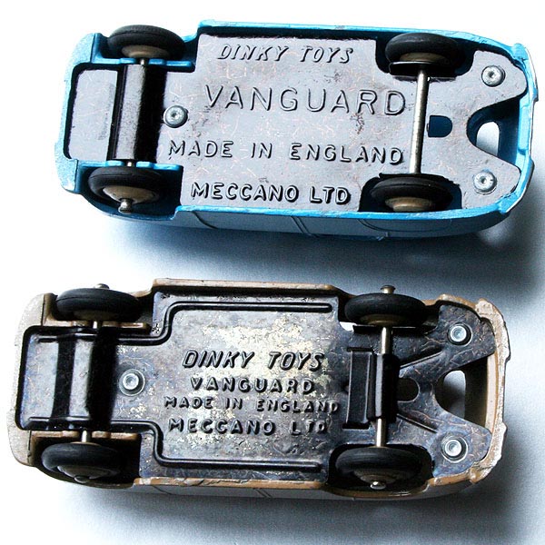 A curious feature of this model is that it was the only one of the post-war British saloon cars to be referred to only by its model name on the baseplate - 'Vanguard' rather than 'Standard Vanguard'. An opposite precedent had been set by 40a and 40b where only the makers name 'Riley' and 'Triumph' appeared, to be followed by 40d,f,g etc. (but no 40c) and subsequent renumberings and new additions all showing the full name of the car in question, i.e. Morris Oxford, Austin Devon and so on. Another example of the oddities that make Dinky collecting so fascinating.