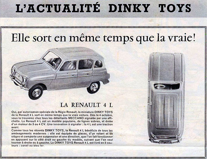 From top to bottom : 510 Peugeot 204, 518 Renault 4L, 517 Renault 8. and there must be some more. The statement translates into : For Peugeot: By authorisation of Automobiles Peugeot, this Dinky Toy has been issued at the same time as the real car. Note the mistake, Dinky Toy is written without an S. As this is a registered trade marque, there should always be an S. For Renault: By special authorisation from Renault, this Dinky Toys has been issued at the same time as the real car.