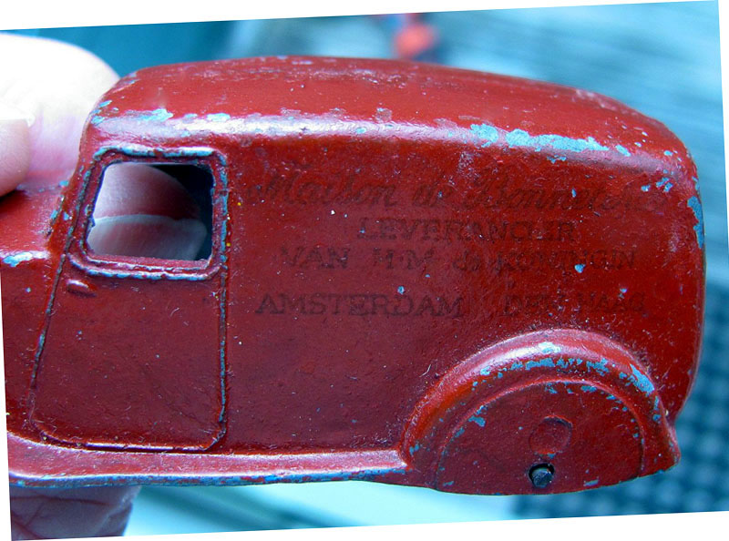 An other Maison de Bonneterie uncovered in New Zealand. Unfortunately the transfers have gone but the text remains visible with the right light. This van seems to be original. Note that like the 29b Streamlined bus, the 60e Dewoitine 500, all the type two 28 vans and certainly several others, there is an ejector mark on the rear wheel cover.' Here is the other side of this rare issue: