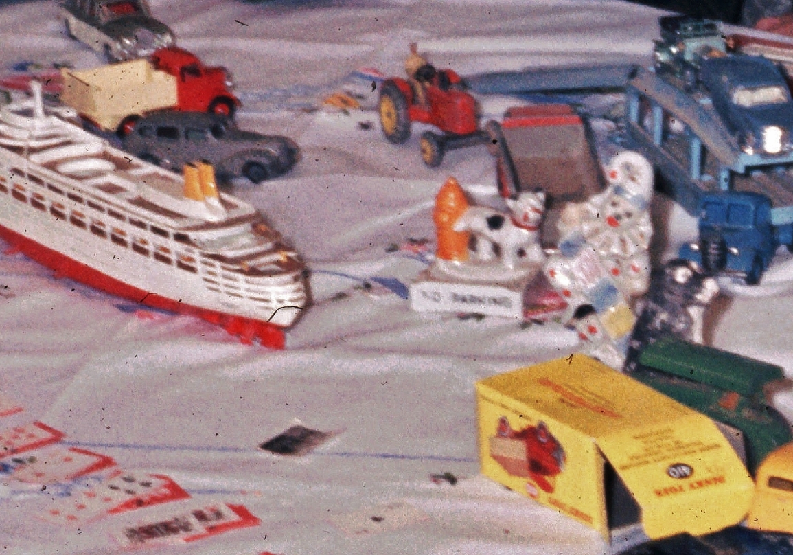 Here she is, sitting on our kitchen table one night in January 1964, partially hidden by a 39a Packard and behind, my 198 Rolls Royce Phantom V with other Dinky Toys on the right, Foden wagon, Massey-Harris tractor, Roller, Pullmore, Mercedes Benz and a Matchbox Models of Yesteryear Rolls Royce. Others that were on the table at the time have been cropped from this slide.