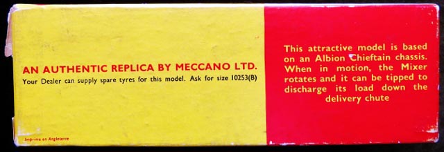 Whereas, the last pictorial end flap box, makes no mention of the operation of the Mixer, apart from 'No 960 AN AUTHENTIC SCALE MODEL' on a black background, and on the corresponding opposite side, the red panel has an outline drawing of the model. Maybe by then, there was no need to explain its operation as lorry mounted concrete mixers had become a common sight on British and other country's roads.