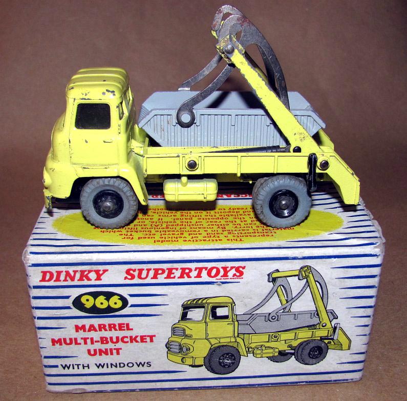 Dave From my post in the 960 Lorry Mounted Concrete Mixer, the following is relevant to the 966: In bricklaying, out here we referred to the bonding agent between bricks as mortar. Cement, as I stated was a mixture of sand and cement. But be it as it may, up until the late 1950s, large concrete works necessitated the construction of a small mixing plant on site. This was quite expensive and time consuming until the creation of a special vehicle that could bring the concrete to the construction site from the plant. In a similar fashion, the 966 Marrel Multi-Bucket system was invented, or as it is known out here, the skip bucket designed to expeditiously remove construction waste. Both these special vehicles were an innovation and Meccano saw fit to model them both using different cab-chassis, Albion for the mixer and Leyland for the Multi-Bucket, both models coming from the same Leyland Group stable. Kind regards Bruce