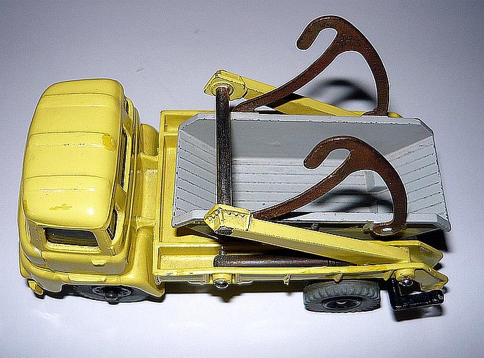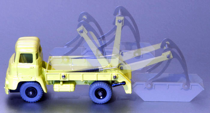 Photo by courtesy of Vectis Auctions. David Sierra is the very lucky winner of a rare and so far unlisted variation of the 966 Marrel Multi-Bucket truck. The truck seems to be the standard one but the skip is striped and looks like it is made of plastic. Please David, let us know if your truck is of the early or later type, with or without the limiting boses shown above by Ron Ford ? I would guess that it is a very late issue. It would be interesting to see a picture of the underside of the skip. Is there a date stamp on the box ?
