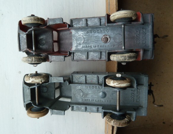 Hello Jan, On the pre war models you can find two different methods for connecting the plate with searchlight and crane to the body. One is with a separate rivet, one with the rivet cast to the plate at underside and gives a smooth floor. Both the models in the picture have thin axles and so pre war. It is not clear to me what was first. As there is no sign of a casted hole in the bed of the truck 22c. I wonder if Meccano drilled this hole or there was a second die. On the drawing this hole is drawn as a dotted line. John.
