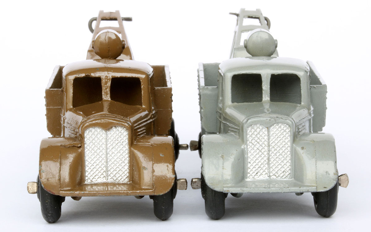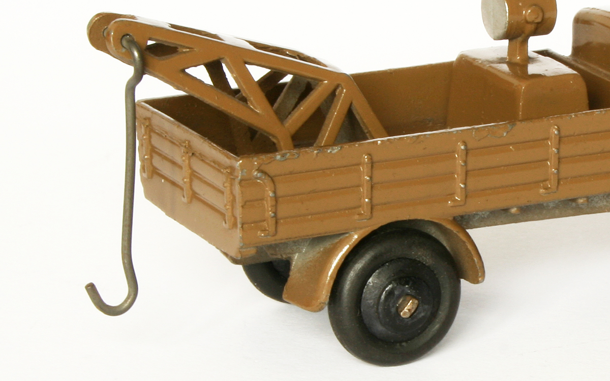 The Breakdown Car shows the same differences in bonnet shape as the Motor Car does (understandably). Now it strikes me that they show a parallel difference in hook mounting orientation, anyway, mine do. The flat bonnet/straight lower windows line model (the grey one in the middle) shows a right side crimped hook mounting, whereas the higher bonnet/angled lower window line example(s) show(s) a left side crimped hook mounting. Is this a 'rule' or do other examples deny this? Furthermore, it strikes me once more that the crane is a rather intricate, vulnerable piece of diecast (with the rest of the inserted base) and not the same thicker, sturdy tinplate that the later CommerBreakdown Lorry uses.