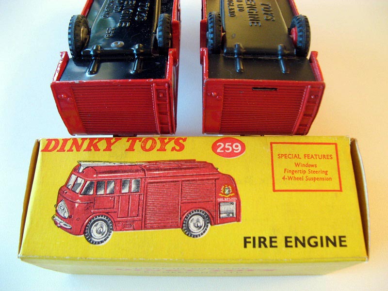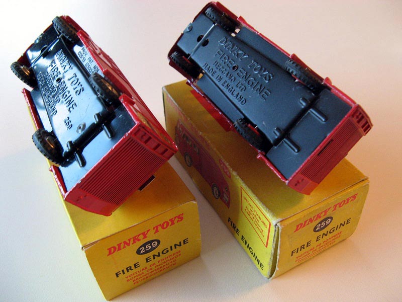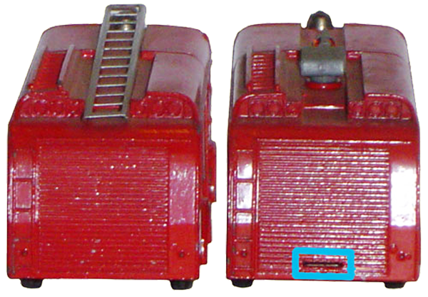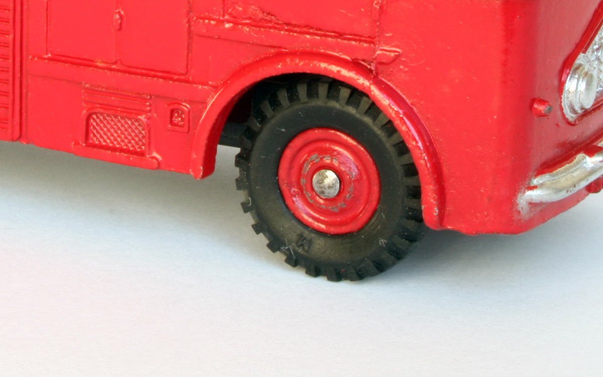 To issue the Airport fire tender ref. 276 in 1962, the rear of the Bedford Miles fire engine ref. 259 has been modified. A slot has been added on the rear panel to insert a lug of the base plate. Although both the 259 and 276 were available until 1969, the 276 Airport fire tender does not seem to have been fitted with plastic hubs. Was it ?
