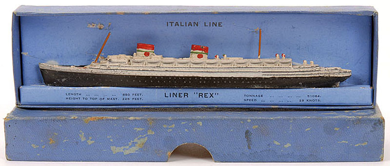 Dear Rob and John, This ship is certainly very rare specially with a good box but is it a promotionnal ? I already have a similar picture and the box is exactly the same. However I do not have adifferent box without for example 'ITALIAN LINE' which would not be evidence but only a clue to make wour box a promotionnal. I suggest to delete the words 'Pre war promotional' from the title of this thread until we are certain that there is a promotionnal Rex. The discussion about is or is'nt a promotionnal is open. Jacques.