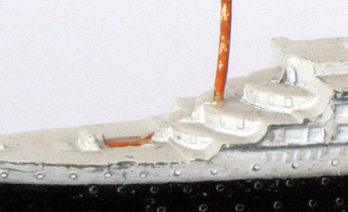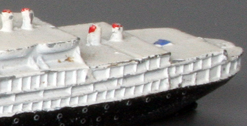 The main superstructure is white, on top of the all black hull. Besides the colourful funnels and the red ventilation intakes a few other details were picked out with touches of contrasting paint. The front deck hatch is painted the same brown as the masts and one touch of blue reveals the swimming pool aft. The overall representation of the real ship, with its nice, pronounced sheer line is very nice and crisp.