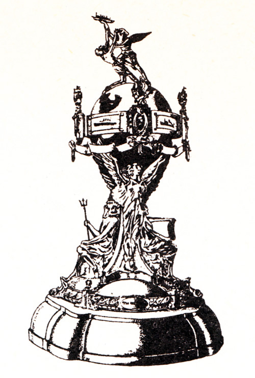 Both triumphs and bad luck were the ships fate. Her maiden voyage in September 1932 was a disaster but in the subsequent year she took the Blue Riband over from the other ship modelled by Dinky, the German Europa.The Blue Riband (trophee above) was the reward for the fastest east-west crossing of the Atlantic.