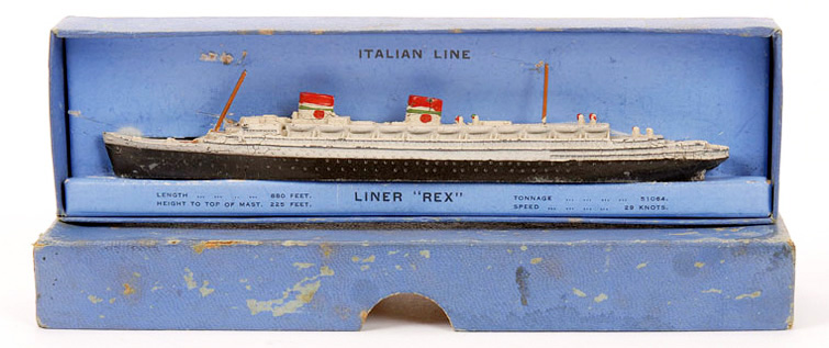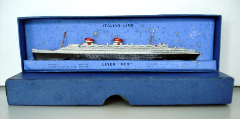 The Dinky model of the now almost forgotten Rex was introduced in 1934, forming set 51 together with its companions Europa, Queen of Bermuda, Strathaird, Empress of Britain and Britannic.