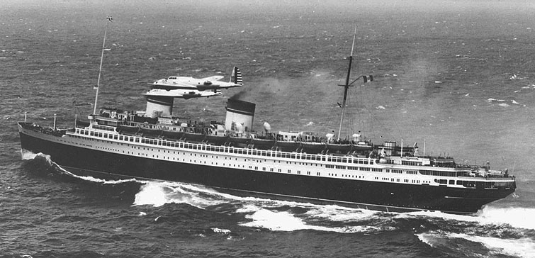 Her sister ship, in the shadow of the glorious Rex, was the Conte di Savoia (48,502 tons gross), not with an overhanging stern, like the Rex, but easily identifiable by her a cruiser stern (like both Queens).