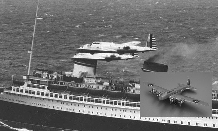 The detail shows the two Flying Fortresse passing along the ship. In fact this early version of the WWII American bomber was represented by a Dinky model as well (see inset, Boeing 'Flying Fortress' / Long Range Bomber no. 62g).
