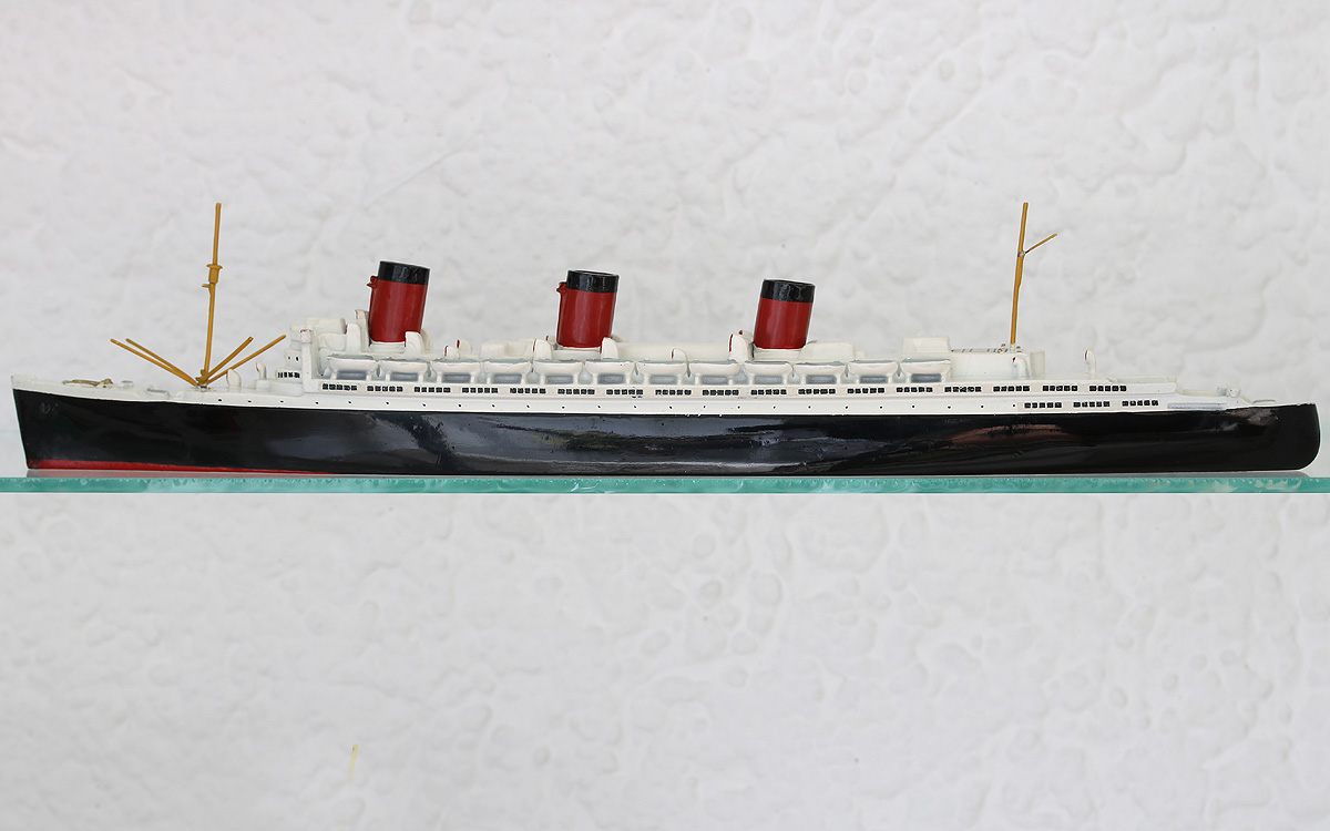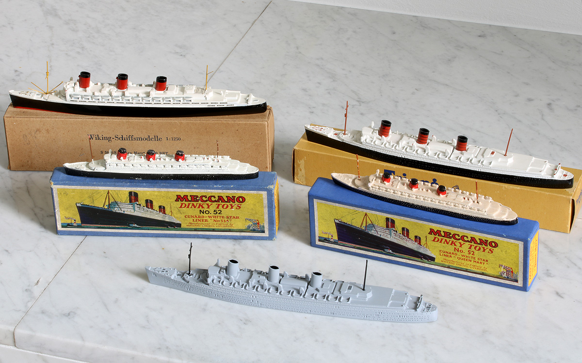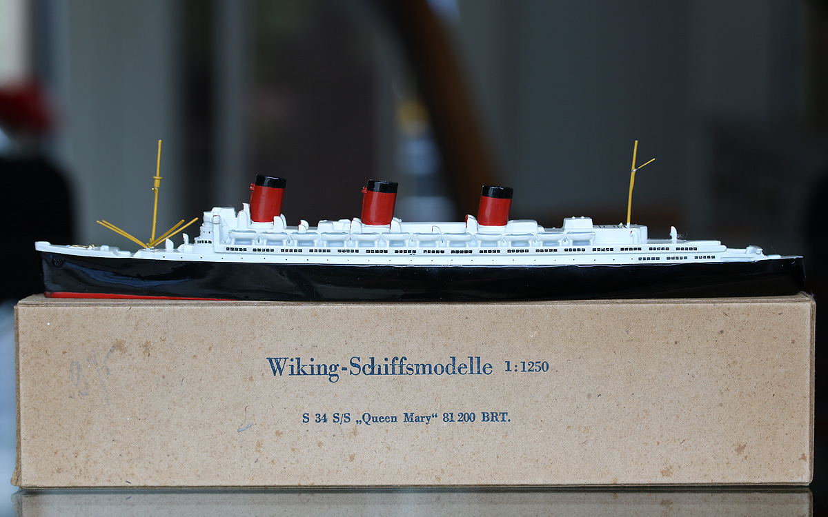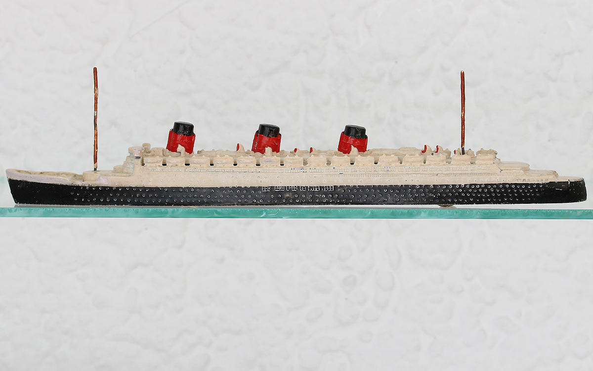 The acquisition - yesterday, from a collector friend, at a very symbolic price - of a magnificent Wiking no. H413 Queen Mary - invites for a comparison with the Dinky Toy and the Tri-ang rendition. The model is cast in lead with some additional zinc. The mould is pre-war (1938) and I presume this post-war re-issue dates from the period 1948-1956. It needed some good cleaning and a bright, as new model showed up. Some comparisons in figures: Dinky 175mm, scale 1/1800, weight 94g (zamac) Tri-ang 259mm, scale 1/1200, weight 175g (zamac) Wiking 249mm, scale 1/1250, weight 455g (lead) I would say, make your own comparisons and draw your own conclusions! Kind regards, Jan