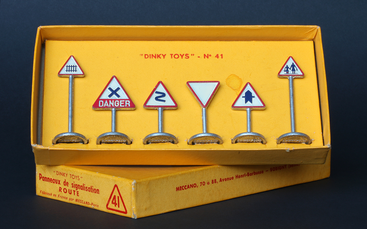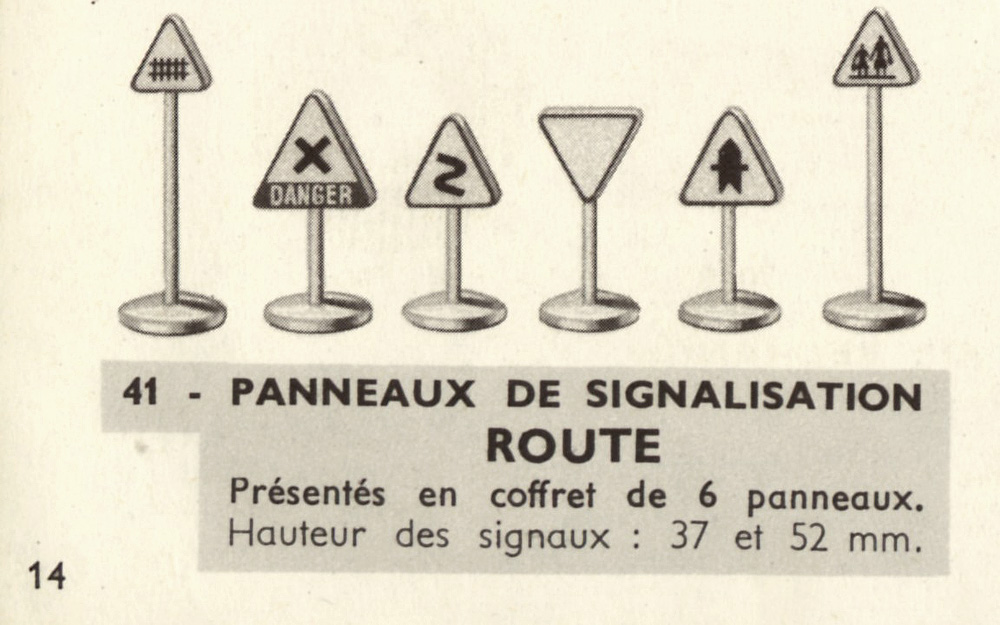 A more detailed photo below of the complementary set 41, together with its representation in the 1954 French catalogue. These road signs comply with Job nr. 7690 International Road Signs (Level Crossing, School, X-Roads without Priority ? with Priority, S-Bend, X-Roads), the drawing completed in Liverpool on 23 January 1953. The specification is: -Passage niveau gard (Level Crossing Gates). -Danger (supersignalisation). Croisement trs dangereux aborder avec prcautions (Cross Roads Danger). -Virage dangereux (Dangerous Bend). -Croisement dune route secondaire (sur laquelle est plac ce signal) avec une route grande circulation (Major Road Ahead). -Croisement dune route grande circulation (sur laquelle est plac ce signal) avec une route secon-daire (Secondary Road Ahead). -Attention cole (School). The heights are various, ranging from 37 to 52 mm. This second set with six triangular warning Road Signs (Route), with their red printed box, lasted one year longer than the previous one, until 1969. Remaining info to be found in the 40 thread. Kind regards, Jan