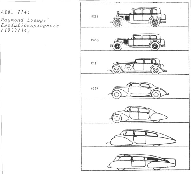Hi Peter, of course this is an extremely interesting topic. I have a Ph.D. thesis by Axel Matthiesen of Hamburg, entitled Vom Kasten auf Rdern zur rollenden Skulptur: die Revolutionierung des Automobildesigns in den 30er Jahren. Or: From box on wheels to mobile sculpture: the revolution of car design in the 1930s (Hamburg 1990). This study exactly covers the streamline revolution in car design. Interesting for those who read German! Here is a vision of Raymond Loewy about the then future streamline development in car design: