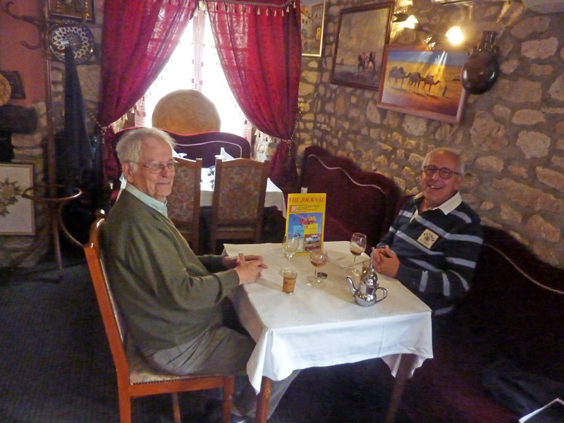 Another small DTCA meeting occured here in May, 2018, in Southern California, when fellow members Bruce Hoy and wife Lina met me and my wife Cindy for dinner near LAX. They had a layover here on their way home to Australia, so it was a great opportunity to actually meet each other after several years of corresponding. Here is a photo of the two of us, along with Bruce's ever present travel companion.....his Dinky Toy DeSoto Fireflite.