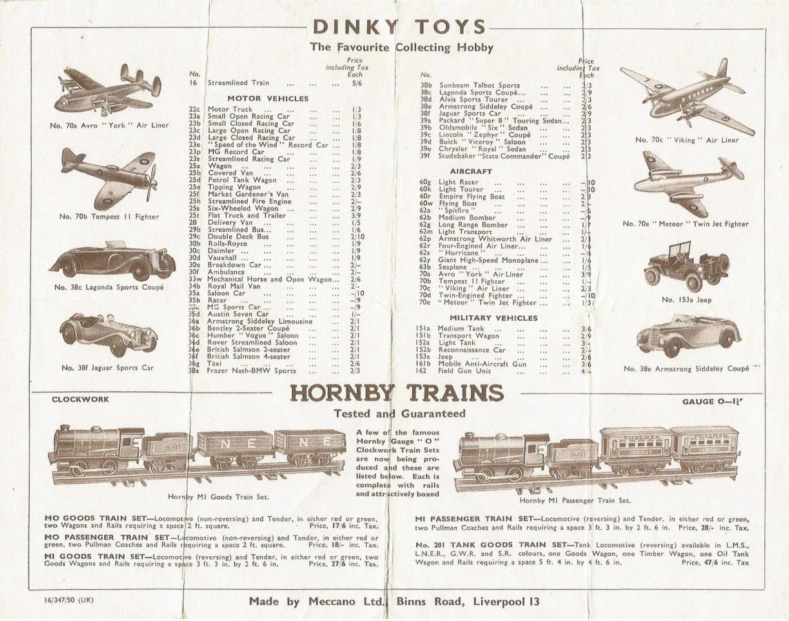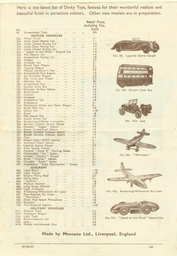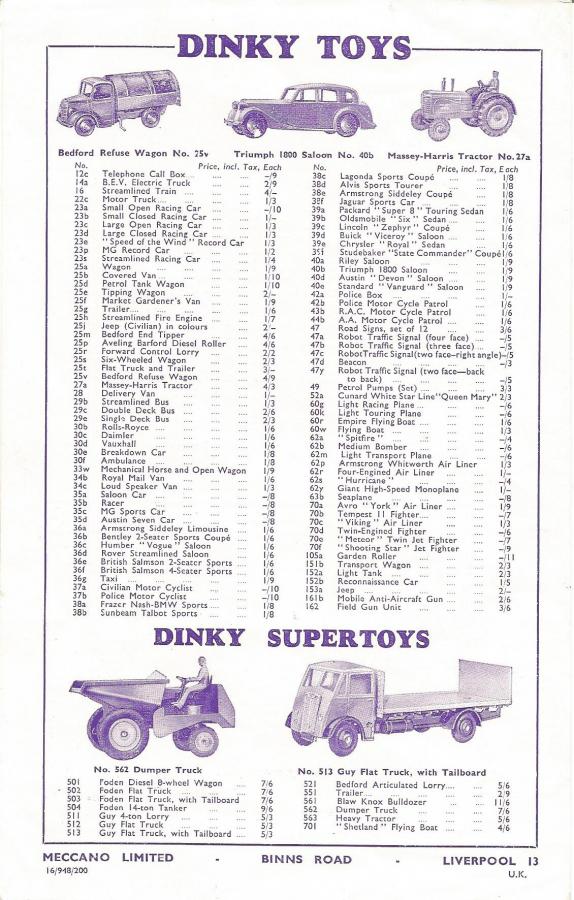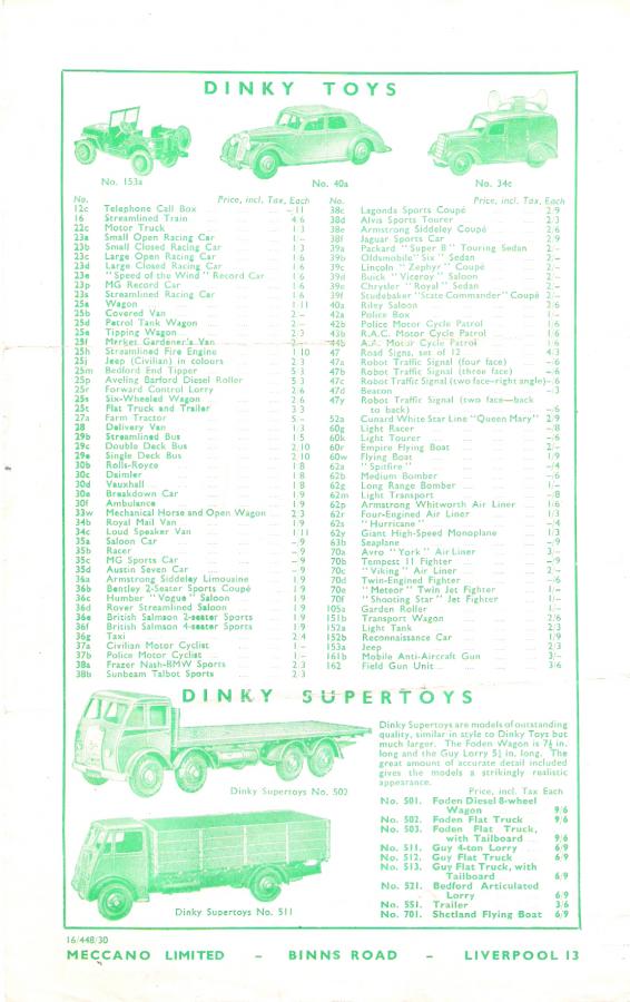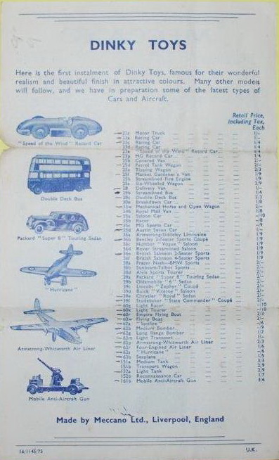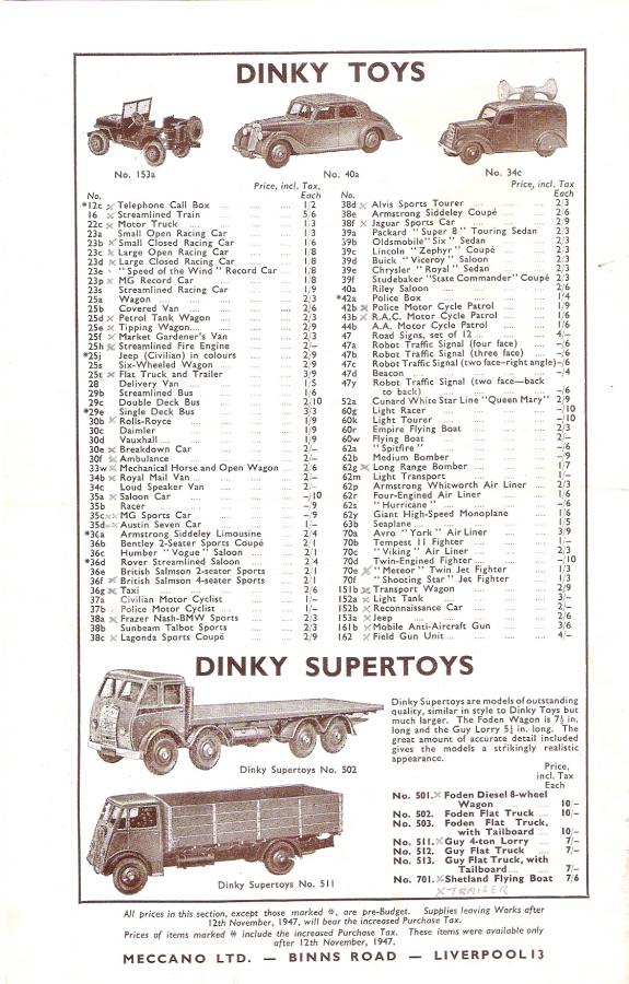 Hello We find many models issued post war but with the same type smooth wheels or chassis from the prewar period. Many in fact I think most seem not to suffer from the fatigue, is this because the models were produced using an improved casting material but using the moulds from the prewar period? I recognise that some stock may well have been left over, but the presence of fatigue in that stock may well have been the reason for upgrading the casting material. Wondered a little here, the point I was getting at is the price list for the models available Christmas 1945, will be the models found with smooth wheels and pre war type chassiss. As I do not have copies of the 1946, 47 or 48 price lists, cannot complete my summary sheet. David
