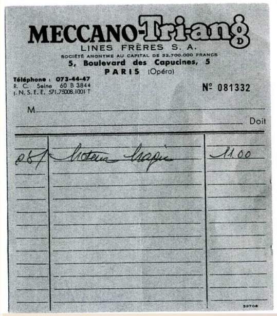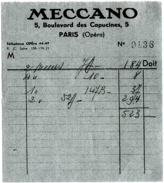In that document, the year 1925, translated into English, stated: 1925: Sees the opening, at 5 boulevard des Capucines in Paris, of the famous presentation and retail sale, which will last until the 1960s. The boxes are black, numbered from 00 to 7, additional boxes, 00A, 0A, 1A, etc. Introduction of colors in the rooms, this is the period Red and Green for steel strips and angles, red being reserved for rigid plates, wheels and pulley. The system includes more than 200 different parts. This clearly shows that Meccano Hall d'exposition et vente au dtail 5, Boulevard des Capucines Paris 2 is part of Meccano Bobigny. Looking for documents to prove this, I also found a few handwritten receipts that I show below. Also a Meccano catalogue 1935-36 with print Meccano Paris, a notebook of Meccano Paris from 1936 and a Dinky Toys catalogue from 1961 with print Meccano Paris.In the encyclopedia of Jacques Dujardin I even still found a French Dinky Toys catalogue from 1963 with the print Meccano Paris. This shows that this Meccano exhibition and sales hall in Paris existed in any case from 1925 to 1963 and must also have exhibited and sold Dinky Toys. The building in which the hall was located is a monumental building on the famous Boulevard des Capucines in Paris (inspired by the French painter Claude Monet and the Dutch painters Piet Mondriaan and Theo Van Doesburg). On the internet I found the photo below of the building on the Boulevard des Capucines with the entrance at number 5. Jan Oldenhuis, 17 August 2021