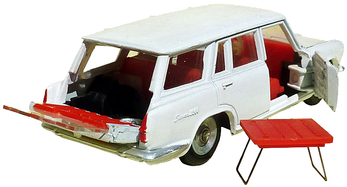 The next model to be issued in December will be ref. 507 Simca 1500 break with die cast base plate riveted to the body, suspension, opening front doors, the rear window slides into the tail gate, as in the real car the spare wheel cover is a camping table, inside fittings, jewelled headlights, spun concave hubs fitted with plastic Dunlop tyres. The photo shows the original Dinky made in France by Meccano Triang.