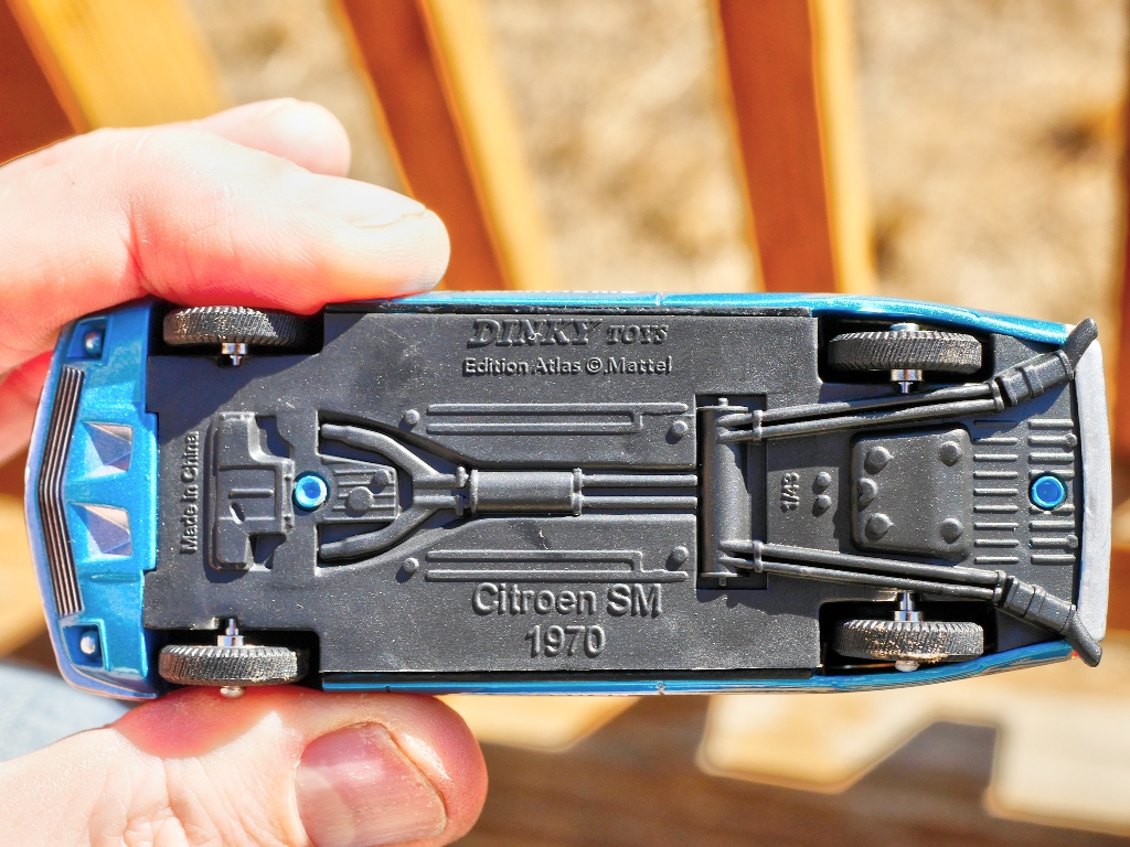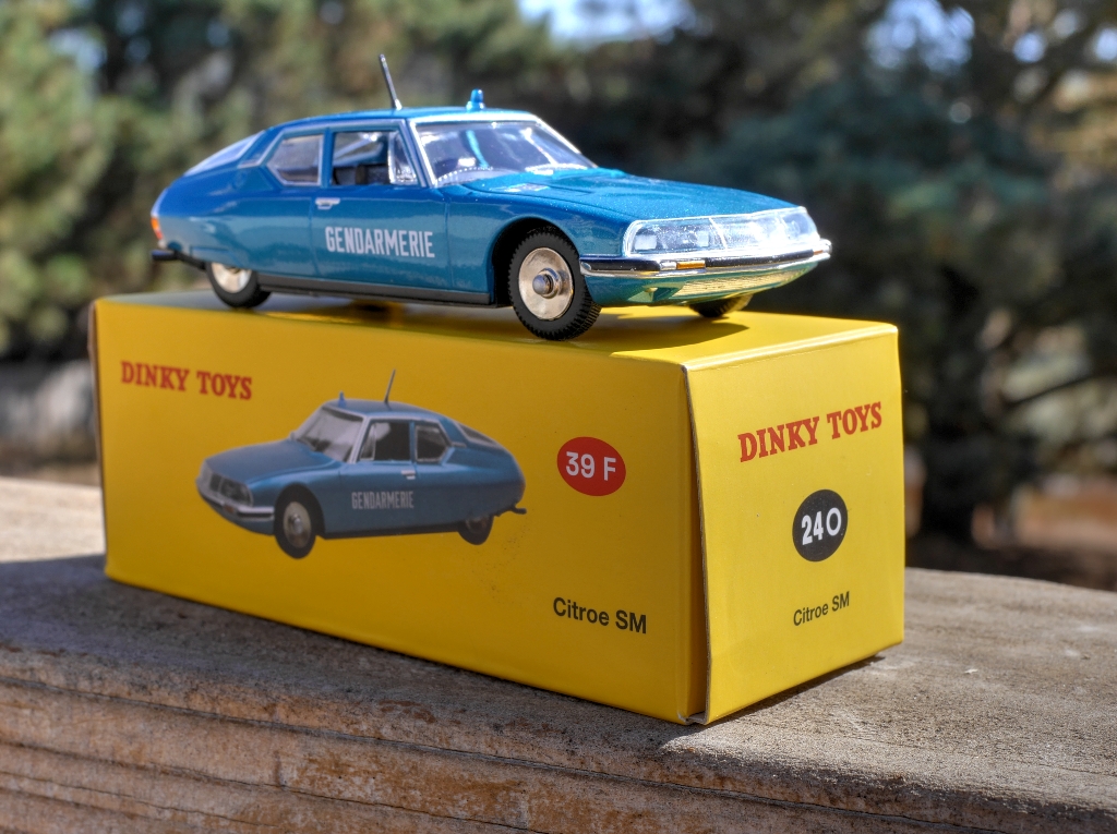 This Atlas 'Dinky' Citroen SM has been showing up on eBay, both in this police version and in gold and green colours. It appears to be their first release that is not copied from an actual Dinky Toy, and bears the usual Norev, Mattel, and Atlas trademarks plus a 2015 copyright date. Many of us have wished that -- if Atlas Dinky Toys had to exist in the first place -- they would have issued 'Dinky Toys that never were' instead of copying actual Dinky Toys. But, this is a strange effort. As my pictures show, the box (but not the model) bears fictitious, anachronistic model numbers of both 24O and 39F, and the vehicle is referred to as a 'Citroe SM'!!