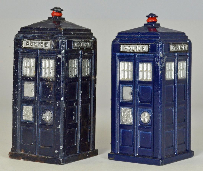 One one of the other forums, someone recently wrote in asking about the apparent difference in size between two Police Boxes that they have. This reminded me of several years ago, when I purchased the pre-war Police Patrol Set, and compared the box that came with it, to another 1950's era box that I also had. I noticed that the pre-war version was somewhat longer, and looked around for answers, but found no comment on any changes. So I deduced that it must be due to metal fatigue, even though mine is in very good shape. I does show very tiny cracks or lines running through it, under the paint. These pre-war boxes are also painted a darker color the post war. Below are a couple of photos of mine, and would like some feedback or comment if you have also notice this. Terry
