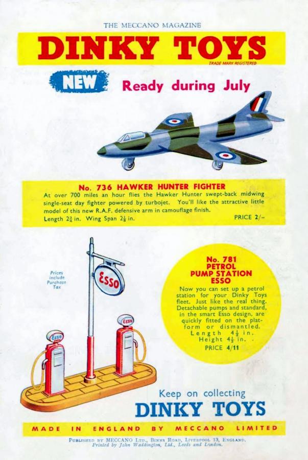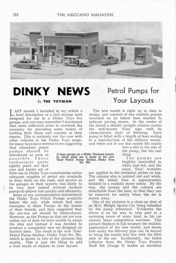 The rear cover of the July 1955 issue of the Meccano Magazine announced the release of No. 781 Petrol Pump Station Esso. This set was a replacement for the pre-war and post-war series of petrol pumps and oil bin, the individual pumps having been deleted in 1953 and the set in 1954. This new item was to bring the pumps up-to-date and with a more modern image.
