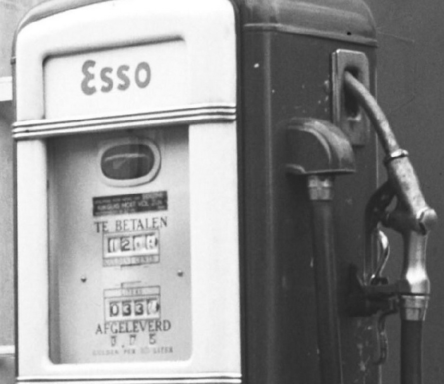 1952 Dutch Esso petrol pump with mechanical count system. These pumps are still equipped with the old mechanical counting system and might only be operated by a pump attendant. On one side the pump has a crank, with which the counter had to be set to zero before the pump could be started. The filling nozzles of these pumps did not yet have an automatic shut-off, which could cause the tank to overflow and gasoline can flow over the edge.