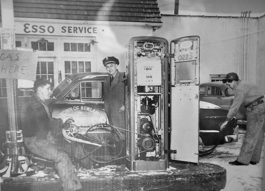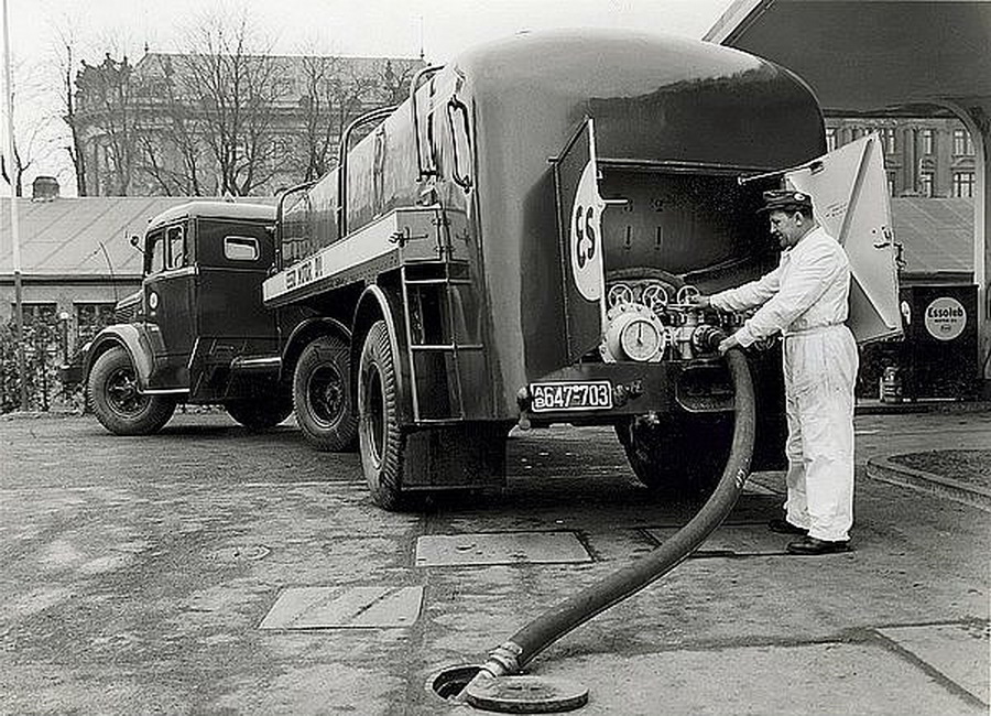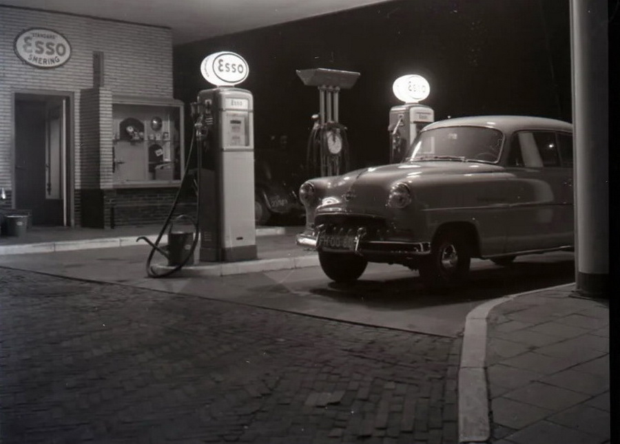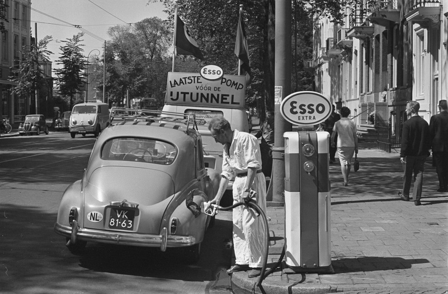 Pump attendant at the last (Esso) pump before the IJ-tunnel in Amsterdam. Note the rotary handle on the side of the pump to reset the counter to zero. The car is an 1957 Peugeot 203 with a large rear window.