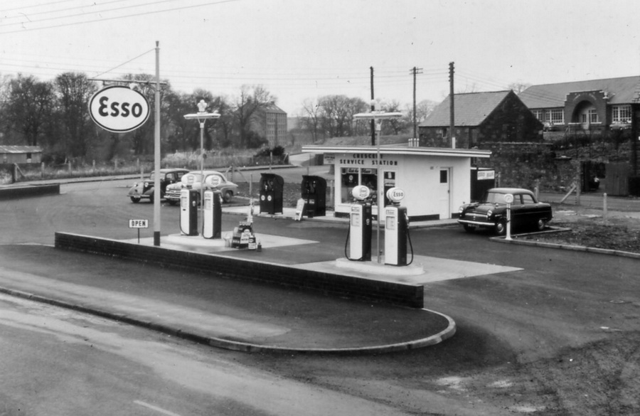 A traditional Esso Service Station with 2 Esso Pump islands and a pillar with Esso sign.
