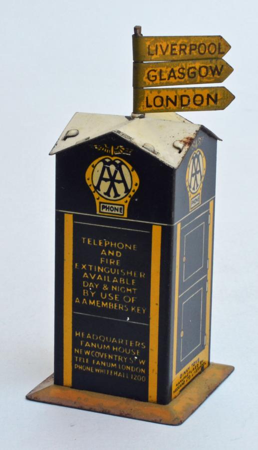 The 44a AA Telephone Hut or box is a somewhat complicate work of tinplate, featuring moving banners or signs on the roof, pointing to wayward locations. Best regards, Terry