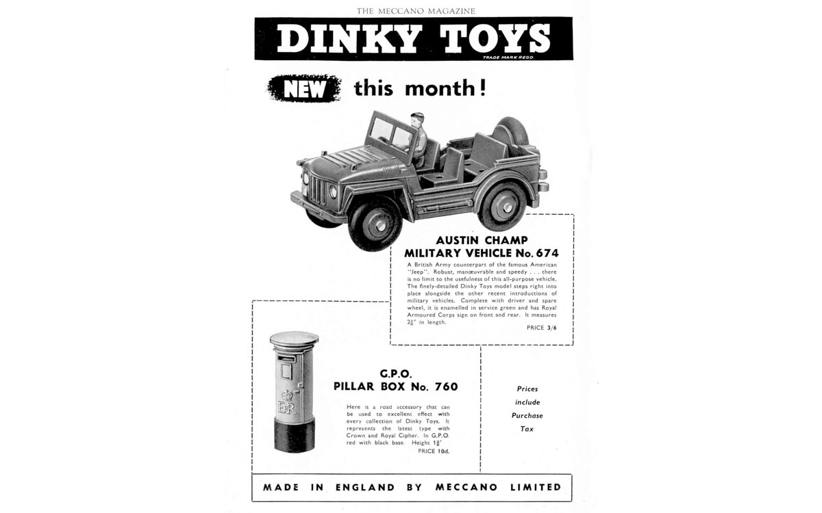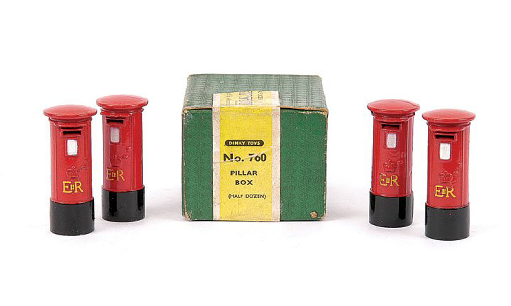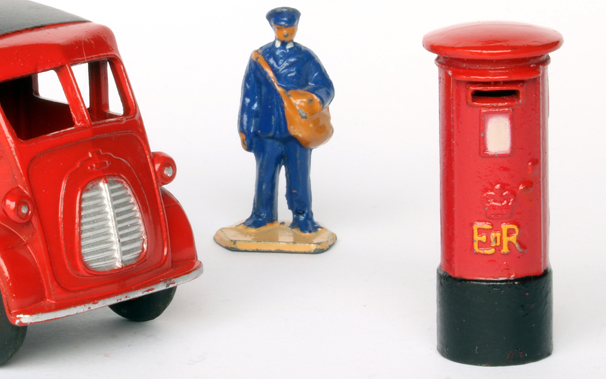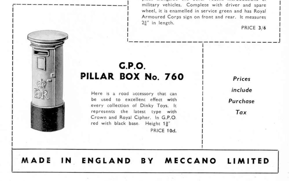 A small item, so a small contribution, with some images. Other than the pre-war version (no. 12a, with oval sign on top and GR symbol) this 1954 introduced G.P.O. Pillar Box is a new casting, without sign on top and bears the new EIIR lettering plus crown, cast in relief and picked out in yellow. Meccano Magazine of July 1954 advertised it together with the no. 674 Austin Champ. It was sold from little green half-a-dozen trade boxes only. If found outside this packaging they are rarely 100% mint, always having lost some minor chips from protruding parts. Strangely, it was not included in the post-war no. 299 Gift Set Post Office Services.