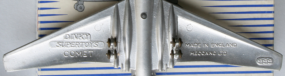 Thanks Jacques I was somewhat surprised to see Meccano still using old box stock for the re-numbered 999, especially in view of the use of stickers over the original 702 sales number on the box. Your model was quality inspected in December 1959 which shows a late production, and one quite unexpected. I state this as my 999 is in the new box with DINKY SUPERTOYS in italics as well as the change of the drawing to show the new registration with the registrations on my model being thinner than yours. And yet it was quality inspected three months BEFORE your model! Do not ask me how this came about, as probably even Meccano had no idea! I am leaving the text in this Post as Al wants to see what is happening with typing on my computer. I will re-do this message correcting all the missing letters and spaces. Continuing with my message, I presume the windows on your model are still square. Actually you mentioned about the thickness of the registration letters in our Post but I was in a hurry to type a message to enable Al to see the mess my posts would have been without spending ages correcting missing letters etc!! As you have never encountered a box with block lettering for DINKY SUPERTOYS that the change occurred during 1957 as it was this year when italic printing was introduced. Finally, the tail on my Comet is identical to the original 702 - white, although the drawing on the box shows the blue tail. Kind regards Bruce (#150) 6 December 2015