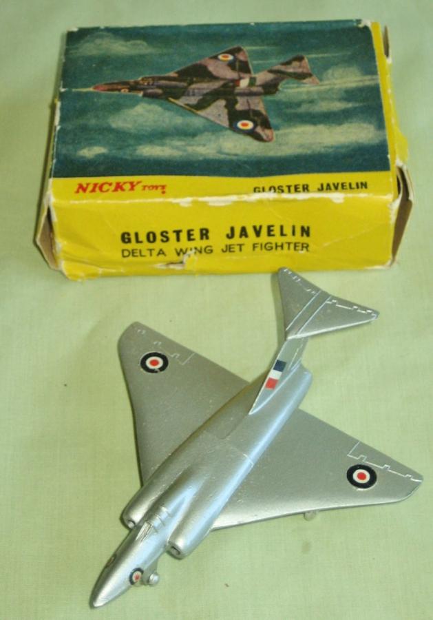 Nice additions, Chris! The Nicky Toys are not bad at all, the wheels seem to be even more firmly - albeit in a cruder way - fixed than for the Dinky. And even the positioning of the tail decals for the Dinky isn't fully correct, as the photo added of the real one may demonstrate. Nice opportunity to post the b/w publicity picture of this model. It was used by the Dutch agent for Dinky Toys. I have some admiration for the manual detailing of artwork like this - see detail added. Kind regards, JanP.S.: for an optimal listing arrangement the header for this thread should preferably read like this (preceded by one dash without subsequent space for a 3 digit reference number): -735 Gloster Javelin Delta Wing Fighter (1955-1966)