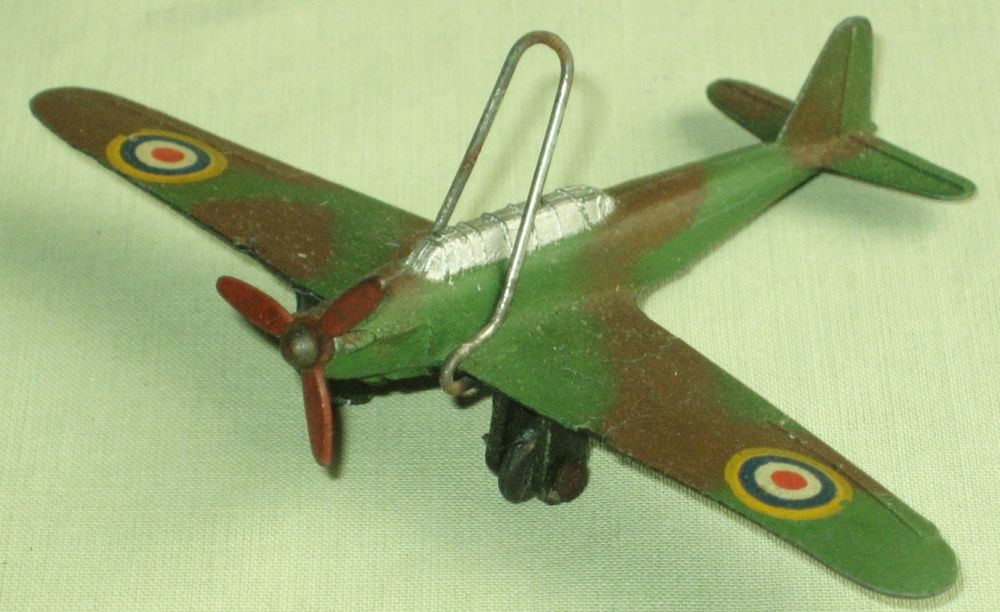 The Fairey battle was a single-engined light bomber with a crew of three, manufactured by the Fairey Aviation Company. It was developed during the mid 1930's for the RAF. However it was relatively slow and limited in range. With only two .303 machine guns as defensive armament it was found to be highly vulnerable to enemy fighters. It was used on early operations in the Second World War but suffered many losses and by the end of 1940 was withdrawn from front-line service and relegated to training units. The Dinky Fairey Battle is an accurate rendition of the aircraft, initially produced with landing gear, which was eliminated after April 3rd, 1940. Various RAF roundels were used during its production. Initially issued as Fairey Battle Bomber 60n (1937-1941) it was painted silver and had cockpit blueing. On the 14th of April 1939 the name 'FAIREY BATTLE BOMBER' was to be cast under the wing. In 1940 it was renamed Medium Bomber 60s and was painted in two colour camouflage with black underside, usually with only one decal on one wing. There were both light and dark camouflage finishes. There were also mirror image camouflage finishes made for boxed sets. Some of these had black & white undersides. All versions have a three-blade propeller, painted red. A rare version is one painted in 'service grey'. While it did not have a gliding hole I have one which has a wire hanger which fits over and under the front of the wings and the loop at the top was designed for the string to pass under it. I also have managed to find one of the rare 'service grey' versions. Chris.