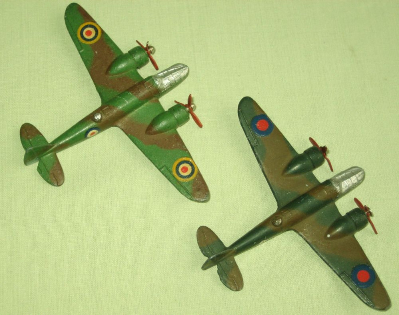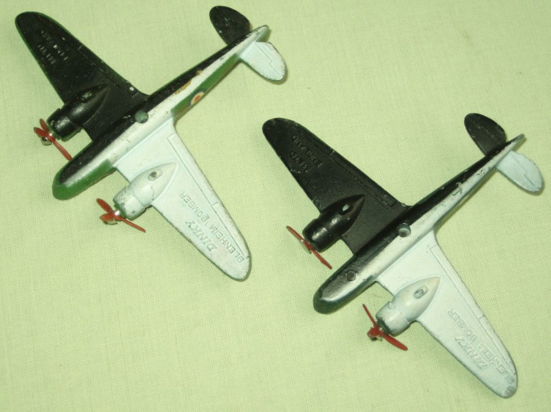 THe Bristol Blenheim Bomber was designed & built by the Bristol Aeroplane Company. The Blenheim was one of the first British aircraft with an all metal stressed-skin construction, retractable landing gear, flaps, a powered gun turret and variable pitched propellers. The Mk1 was faster than most fighters in the late 1930's but the advance in the development of monoplane fighters made it more vulnerable by the time World War 2 broke out, though it was successful as a night fighter. The Dinky Bristol Blenheim was first issued as Blenheim Bomber 62b as a one-piece casting, painted in silver. It was never issued with a gliding hole or landing gear. Later it was issued as 62d with two colour camouflage and black & white underneath. The camouflage could be either light or dark with different roundels. It had a silvered cockpit and gun turret. The Blenheim was reissued after the war as Blenheim Bomber 62b painted in silver with various roundels. All versions had two three-blade propellers, painted red.