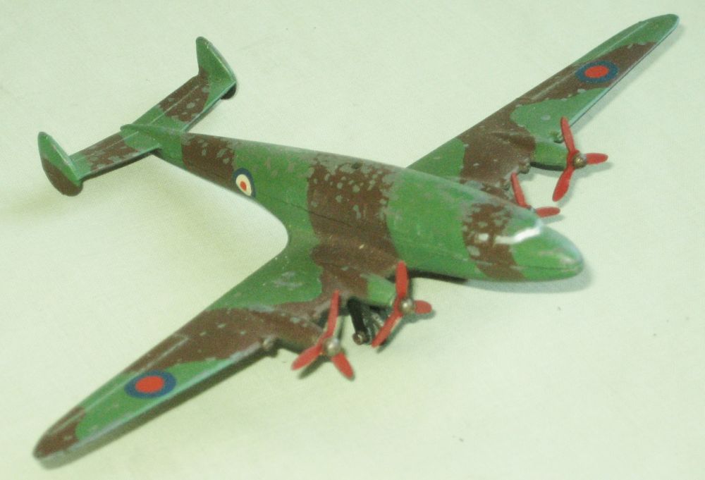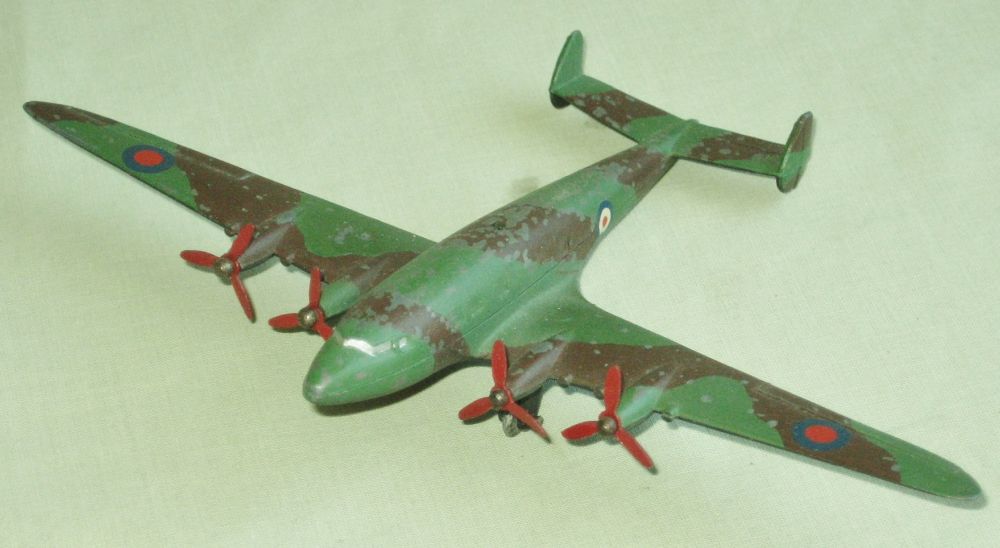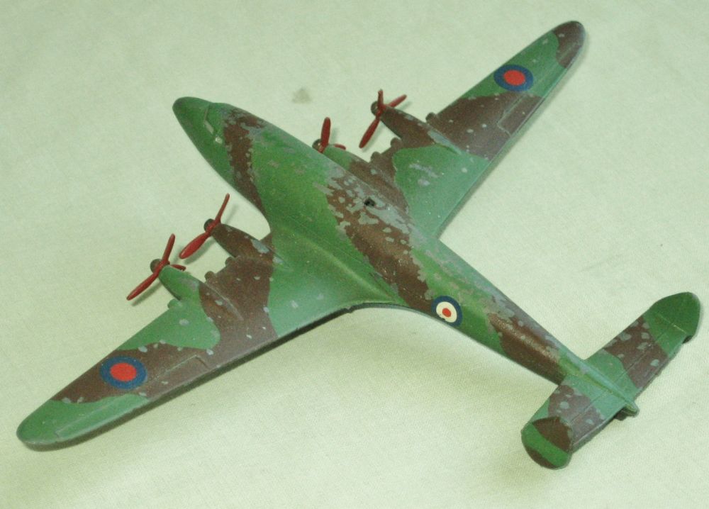 The Frobisher was a 22 passenger version developed from the De Havilland Albatross for Imperial Airways, and first flew in 1937. Both the Albatross & the Frobisher were requisitioned by the RAF during World War 2. The Dinky Frobisher is cast in one piece with 4 engines each of which has a 3 blade propeller painted red. The undercarrage consists of 2 wheels on a small axle held between two cast legs. This version is painted in 2 colour camouflage, in this case the light version. The underside is painted a dull black and the cockpit windows are painted silver. It has 2 RAF red & blue roundels on the wings and 2 red, white & blue roundels each side of the fuselage. The wingspan is 5.7'/145mm. There is a hole in the top & bottom of the fuselage for a split pin to be used in the Gliding Game. Chris.