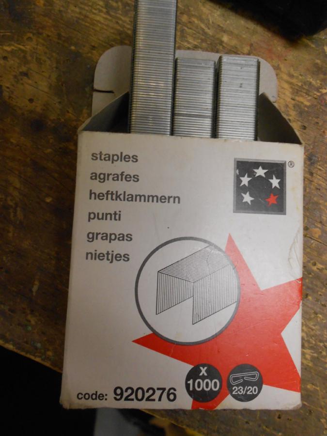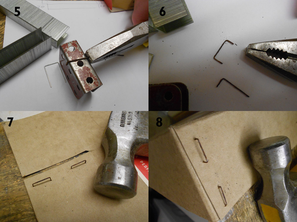 I'll see if I can make a fake staple making video tonight. Using only tools probably everyone has lying around - a bit of wood, a hammer, pair of pliers and (optionally) some bits of meccano. For staples, I use 23/20 - my brand is 5staroffice. Jacques is very likely correct that a box stitcher would have been used on the original trades.