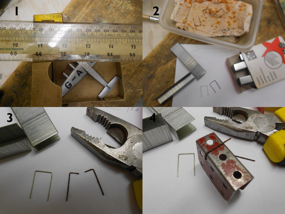 Trade box fake staples - how to make and install them. An original Dinky trade box staple (1) is about 14mm on the crown. Now I could not find any manufactured to size staples but I can buy 20/23 large staples (2) in boxes of 1000 from most stationers, split them apart and scrape off any glue. They are, of course, not rusty staples but a few days exposure on a tissue soaked in salty water soon acquired the required appearance. Then I cut the staples mid-crown (3) with the pliers - just judging by eye. Now it just happens that a Meccano channel bearing is just the right width (4).. but you could make a wad of glued card as your measuring guide. Gripping the leg of the staple with the plier jaws (5), I bend 90 degrees and now I have a new staple with a 14mm crown (6). I locate and tap in my new rusty staples through the first layer of card flap (7). This bit of wood is a good size - about 12' x 24' - which I can straddle across my lap to get on top of the work. Tucking the lower flap and squaring up the corner with the edge of the board, I tap the staples through (