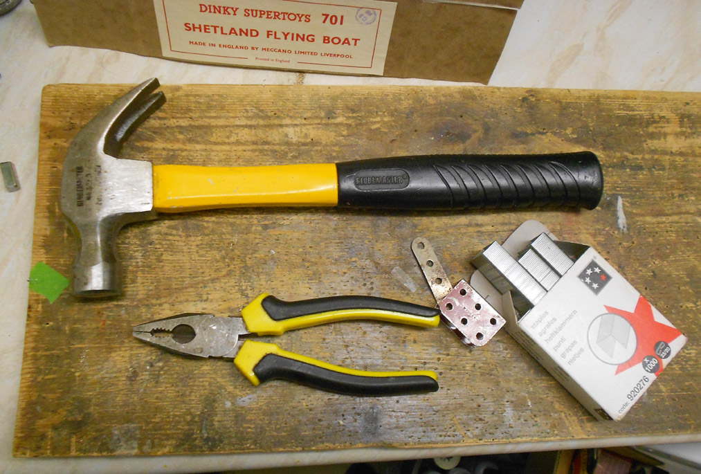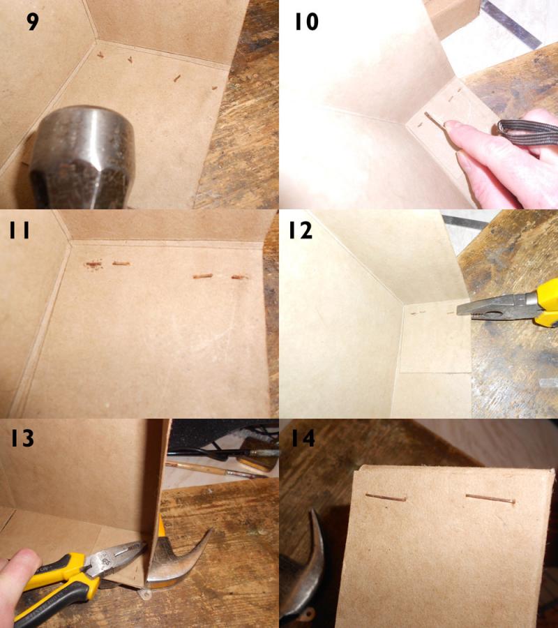 . Working the staples all the way through now, their legs are open and somewhat crooked (9) but I can generally fold them down with a strip of meccano - or a butterknife or whatever else you have to hand (10). They will not fold exactly flat (11) so they will need a squeeze from the pliers (12) to close them completely. Of course the pliers will not reach to crimp a deeply set staple but I use the hammer as a last and tap the staple with the nose of the pliers to close them up (13). And there we have the finised effect (14).
