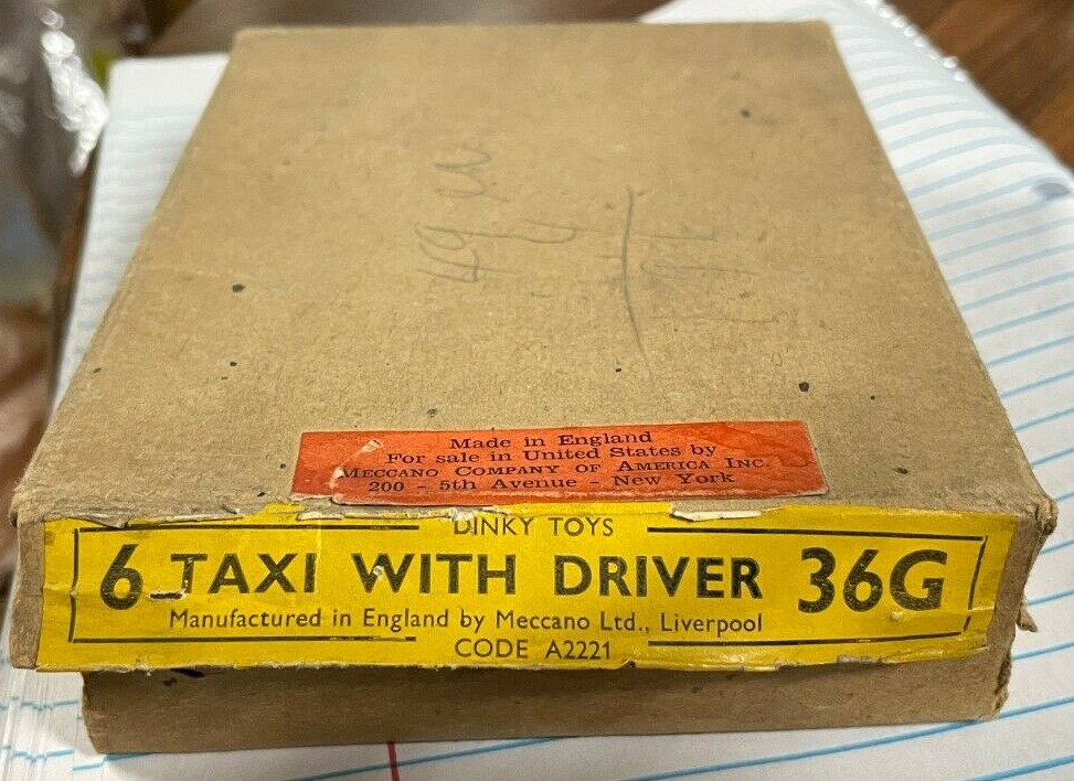 The first mention of H Hudson Dobson is said to be on the cover of the 1938 Meccano Catalogue USA edition. You'll probably recall that these catalogues have a space to overprint the address of the local dealer.Your taxi box is the kind we associate with war austerity - although we only assume that austerity was why the boxes were simplified. And we don't really know how long it took Mr Dobson to use up all his old labels - if there was a war on, he might not have wanted to waste any. I'd speculate the taxi box was towards the last of the prewar production.