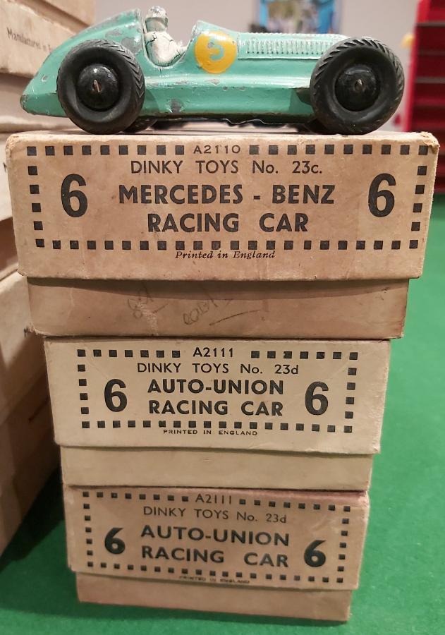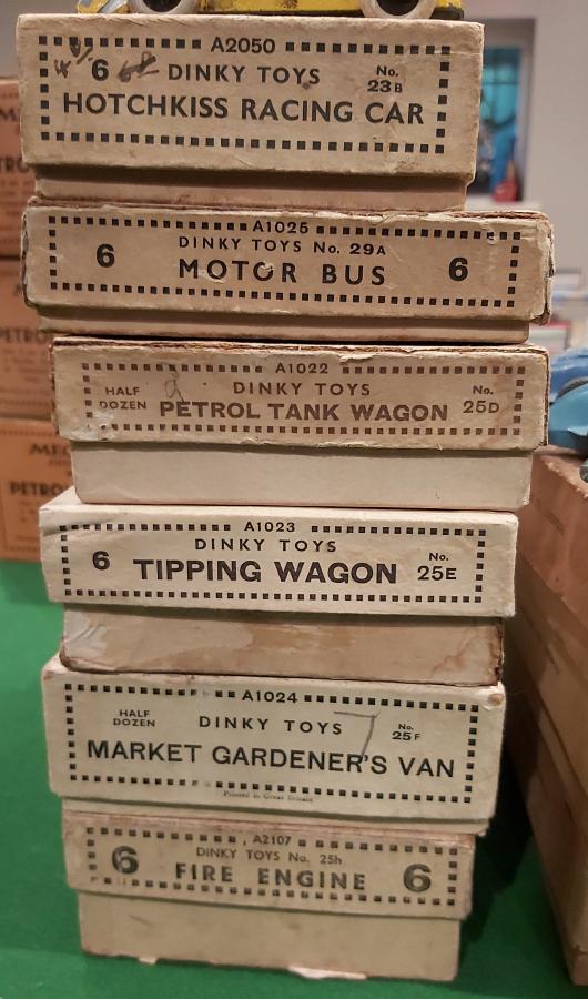 The 25h was a number missing as I have the privilage of having a full box, albeit filled it myself. Have in excess of 300 post war trade boxes and 60-70 prewar trade boxes and continuing to increase I hope. Also managed to speak to David Cooke on the telephone who has asked me to send him by post my list of haves and havenots, so will be sending him that list soon. He has many more than I but like me many duplicates and does the same by filling them with the different colours that turn up. Have found that the Ramseys list now requires up dating as there are many I have that are not listed. Also, have wondered why 'Type 1' is the only category for the prewar trade boxes when I think there should be at least five. Yellow coloured with printed upper surface of lid Yellow coloured but with plain upper surface of lid Salmon coloured Beige or cream coloured Blue coloured Also have noticed that some models, like the covered wagon has boxes that have models stored vertically and on there side as well as the colour diferences. Have purchased but awaiting arrival is a trade box of 12d Telegraph Messenger's but on the picture it did not show any 50000, s number reference, will updated when received. Do you think that is likely that there is a Trade box for each of the figures which would perhaps surgest that the intervining numbers represent the elusive boxes. Bought some back numbers of the Journal via eBay and noticed David Cooks advert in the wanted section appealing for trade boxes, so might continue with his challenge and request via adverts. David David