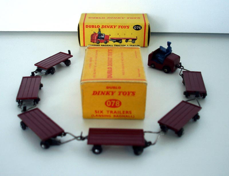 The 076 was one tractor with a trailer, the 078 was a trade box of six trailers. It was a common sight to see a tractor and multiple trailers at the larger Railway stations such as London, Leeds Birmingham etc. Usually operated by Royal Mail with the trailers absolutely full of sacks. The individual availibility allowed a realistic set up on a platform. When I bought my Dinky illuminated sign there was also an 078 trade of trailers but by then I had spent up!!! Dave