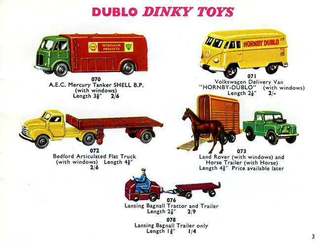 hoort wrote: 'Hi all, An unusual small trade box of six 078 Lansing Bagnall trailers. The Lansing Bagnall is towing all six of them. I wonder whether or not these trailers were sold seperately or sold as a set to make a small 'train'. Kind regards, Rob ' Rob How were the trailers packaged inside the larger box? I presume wrapped individually with tissue paper. Mr Toyman in his article announcing the release of the Lansing Bagnall Tractor and Trailer #076 in the June 1960 issue of the Meccano Magazine, and he indicated that the trailer would be available from dealers separately. A price leaflet dated June 1960 includes the 078 trailer. I have a Dealer Order Form dated Mid-November 1960 with the 078 trailers the wholesale price of which was 4/8 for the box of six and the retail price of 1/4 sold individually. Based on a price list, the 078 was available at least as late as August 1969, far later than 1964 quoted in some modern-day catalogues. As a matter of interest, the 078 trade box of six Lansing Bagnall trailers was the last Dublo Dinky manufactured, and it made its last appearance in the Dinky Toys Order Form dated July 1969. Kind regards Bruce