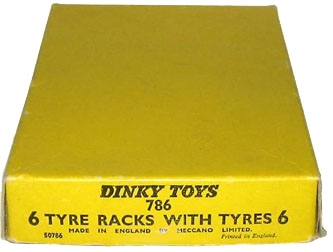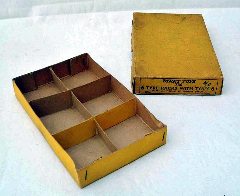 Dinkinius wrote: 'Trade box with dividers for the 786 TYRE RACK WITH TYRES priced at 4/- each. The price indicates a late issue as 4/- was the advertised UK price for each tyre rack with tyres during 1966 and 1967. ' This box then may have been older stock that was issued early in 1966 as the last price notification of 3/11 came in August 1965. Followed by the last type as shown by Jacques' box without the border. Certainly the price of 4/6 was current for the time-frame quoted, and Meccano was rather rigid on issuing firm price charges rather than suggested prices.