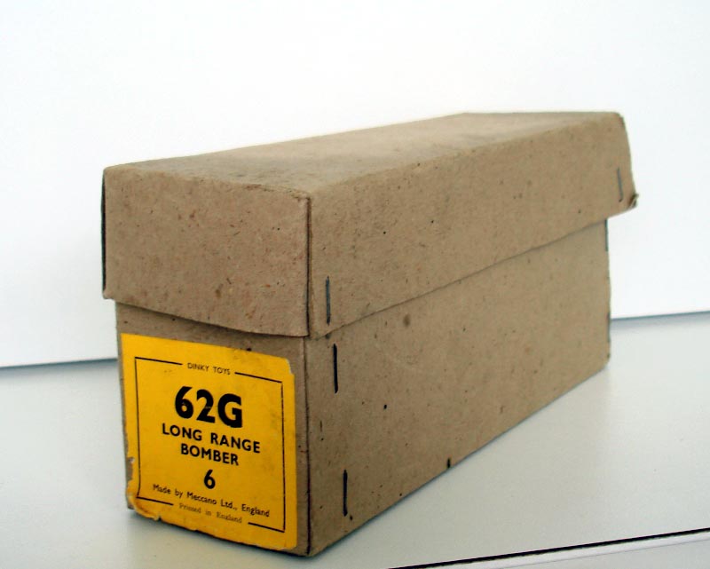 hoort wrote: 'Hi all, Last week I received a trade box with 5 62G Long Range Bombers. The tail section of three of the models are covered with a silver colored paper to protect the tail transfer. One of the models carried the whole protector. I also found a loose protector on the bottom of the trade box. On one of the models the protection is a bit loose and it showes the transfer partly. I am sure the transfers will be damaged by removal of the protection, so I will leave them as they have been for more than 60 years. Anyway, I have never seen this protection before and I am curious if anyone has. Kind regards, Rob ' Rob I too have never seen a protective covering similar to those in your trade box, which incidentally, is a wonderful acquisition, and full marks go to you! One thing I found unusual in looking at one of your pictures, the rudder appears to have been given an outline. Then I came to the realization, that someone has 'converted' the C/D model on which the Dinky 62g is based, to an E model which had an extended dorsal fin and enlarged tail unit, totally different to the earlier model B-17. It is certainly not factory fitted, as it would have involved too much time for the ladies to insert this type of 'protection'. Besides, once inside the box with its dividers there would be no need for this type of protector to exist, when tissue paper would have done the same job which makes me think my supposition is possibly correct. One other thing I noticed it appears as if most of these models have been displayed outside the box, as the National Insignia are quite faded. Still, the box and models are an excellent acquisition, and I hope it did not break the bank! Kind regards Bruce (150)