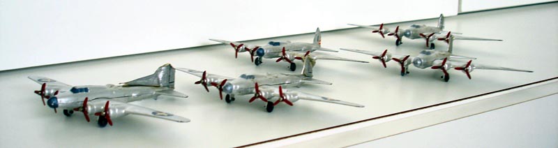 Hello Rob, Very nice box. This brown cardboard box was used from 1945 to 1948 as production of the Boeing bombers stopped. So a rare box and they are not often offered for sale. I have one in my collection. Recently two were for sale on the well known auction site and you bought one of them I presume. I have never seen the silver protections but these could be original as Meccano used a lot of different protections for models in tradeboxes. Your bombers still have the pre-war prop pins and this means the models are probably from the first production in 1945. Later Long range bombers have the disk type pins. On the drawing the name Flying Fortress changed to Long range bomber 20-6-1945. A box with original models is a great find and a nice addition to any collection.. John.