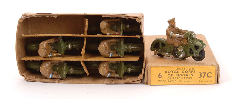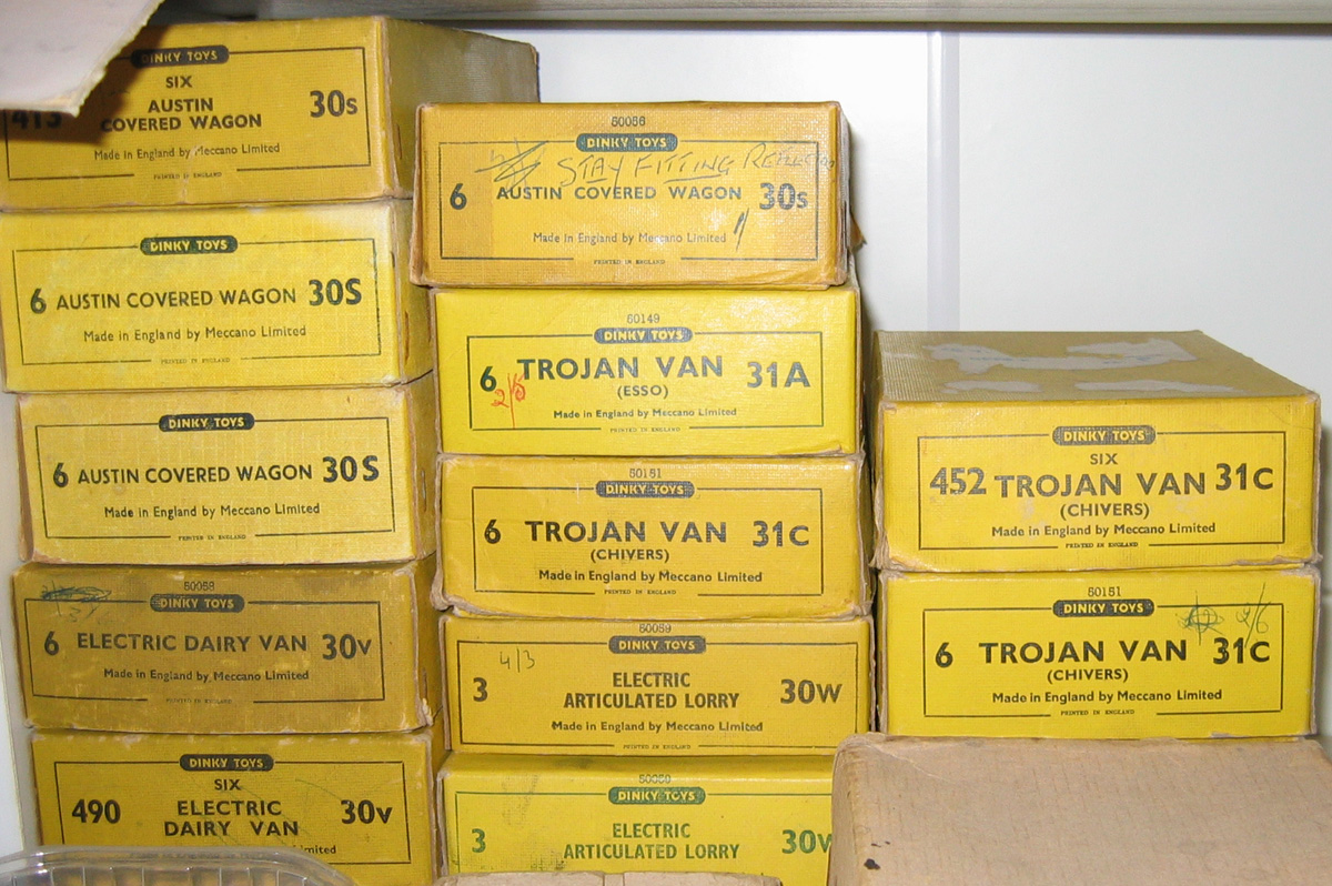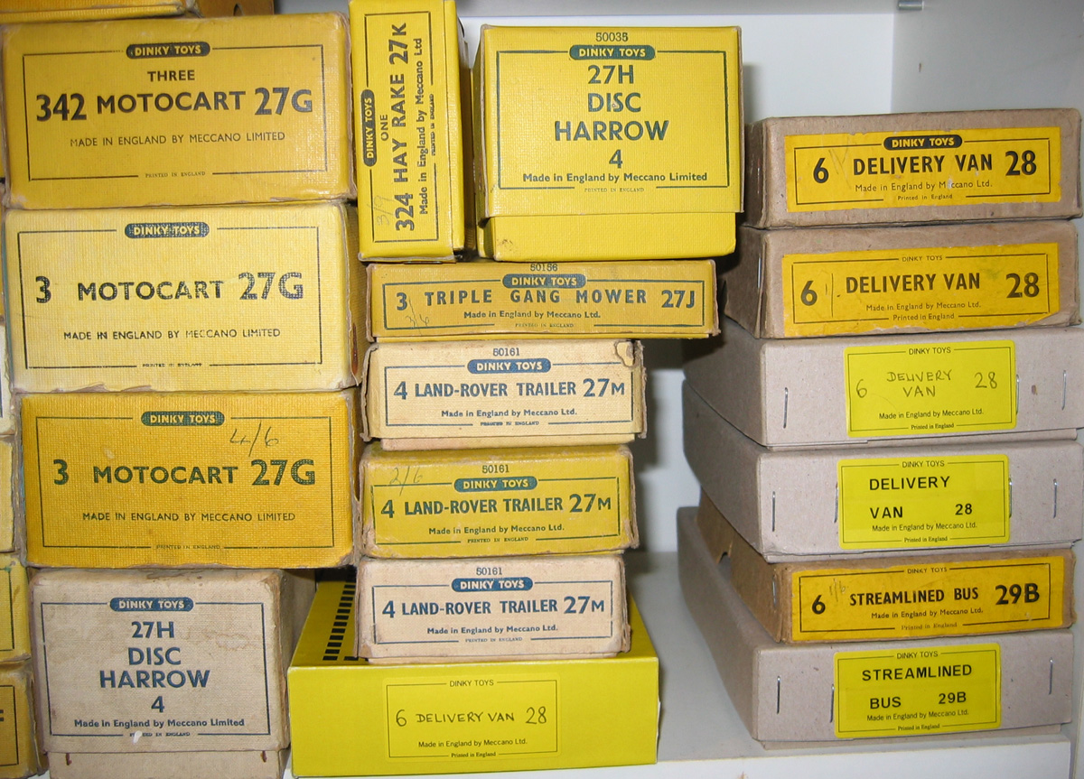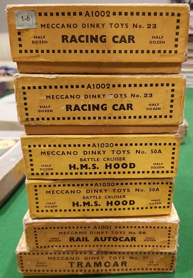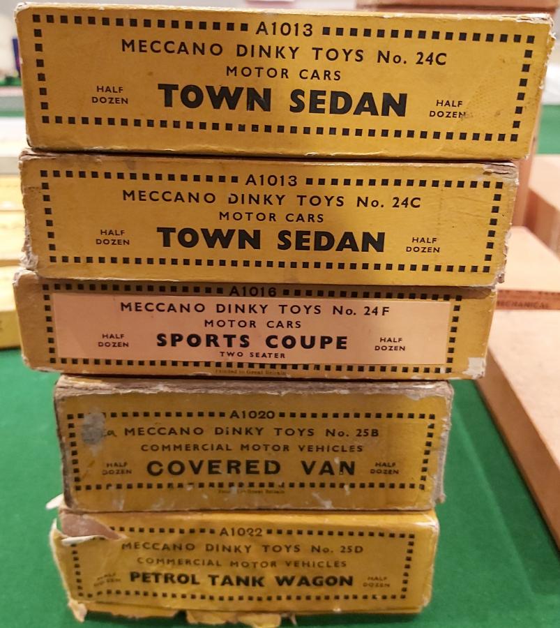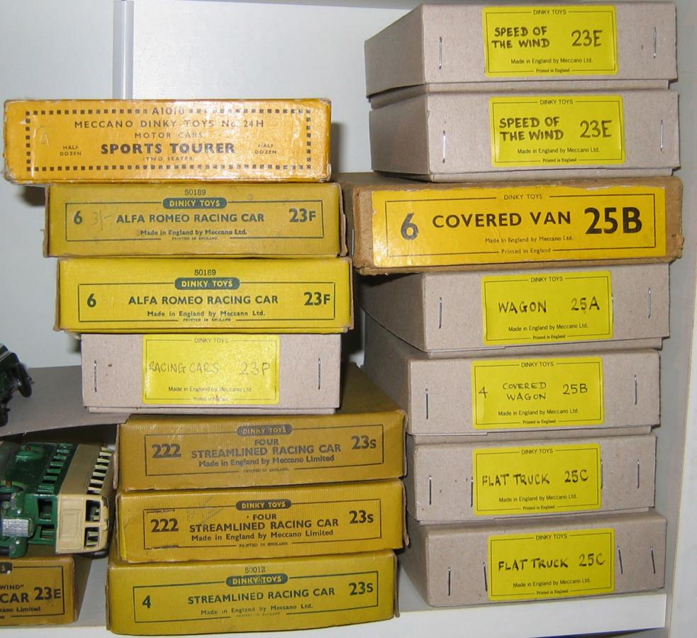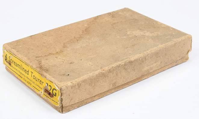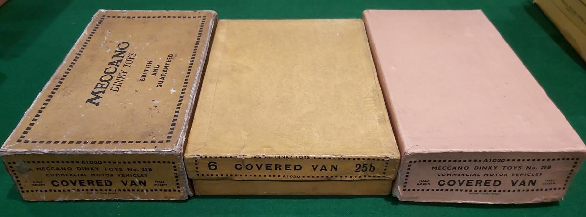 The Telegraph Messanger has arrived and it is as you have pictured above. Thank you for your detailed description of the trade boxes, have a few Modelled Miniatures boxes, 22 & 24 sets. My 22 is full and in excellant condition but my 24 is not complete yet. Your comment about the Beige and what I have called salmon coloured has consistantcy accross each of my examples and would have thought fading would be an inconsistant reaction. Interesting though, the more examples found the the more accurate our assuptions could be. After all this 'Covid' look forward to bringing together many examples of the trade boxes to understand better. The 29c Trade box as you say has the horizontal and vertical versions, but there are two sizes of the vertical, have multiple examples of all three types. Think the two verticals have a side by side storage ie accross the box and the other is the models parallel with the long side traditionally divided. There are one or two other boxes of slightly differant sizes, side packed or wheel down packed. haven't seen any prewar boxes just plain brown card, all the examples I have don a post war label, will have to look out for those.