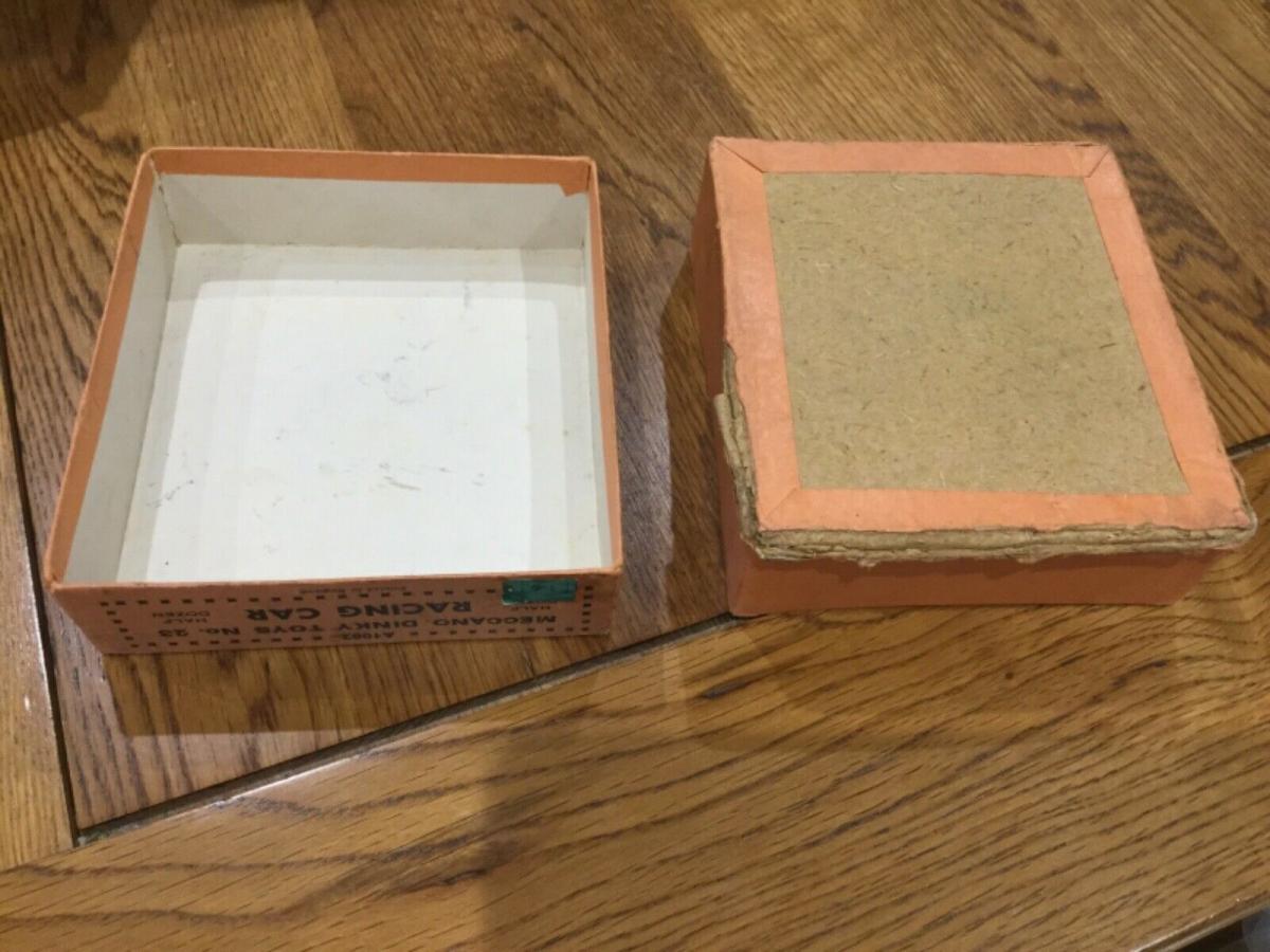But I'd maintain that colour fading would explain much of the paper variations we see. Fading can occur by evaporation and with humidity as well as by UV bleaching.To define the salmon colour boxes, I'd say this Racing car trade would pass as salmon ... on the lid the colour intensity has fallen so steeply that it doesn't resemble at all the vestigial colour tone surviving in parts of the base. Then comparing to another example that has somehow endured in some sheltered situation ... clearly a sibling and clearly quite orange all over. Prewar 29c brown box image for example ref