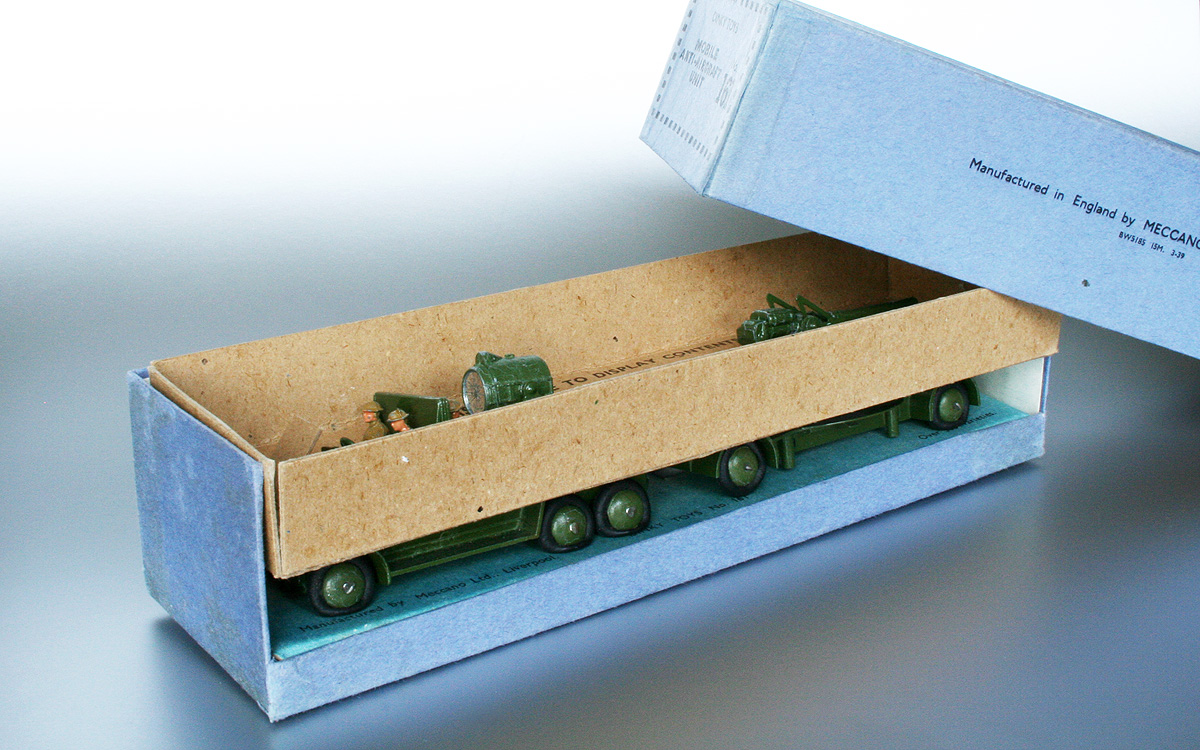 What's in a name, Bruce? If only the contents answers to the description. Priceless, well, I do not show the horrible or wanting boxes! But I must confess that in the past, say 15 years I have been more aware of and fascinated by (the quality and information of) the boxes. I bought the two items below just for the boxes only, the contents usually worth even less than their packaging. The box the French put their import 571 Coles Mobile Crane in is hardly known, available 1951-52 only. I have never seen a better example. I found the very nice box for the 18-Pounder Quick Firing Field Unit no. 152 as a bargain, with completely shattered contents inside. I replaced that (a little incorrectly) by my post-war set, which was sold from trade boxes only. (I hope others will also contribute here ...). Kind regards, Jan